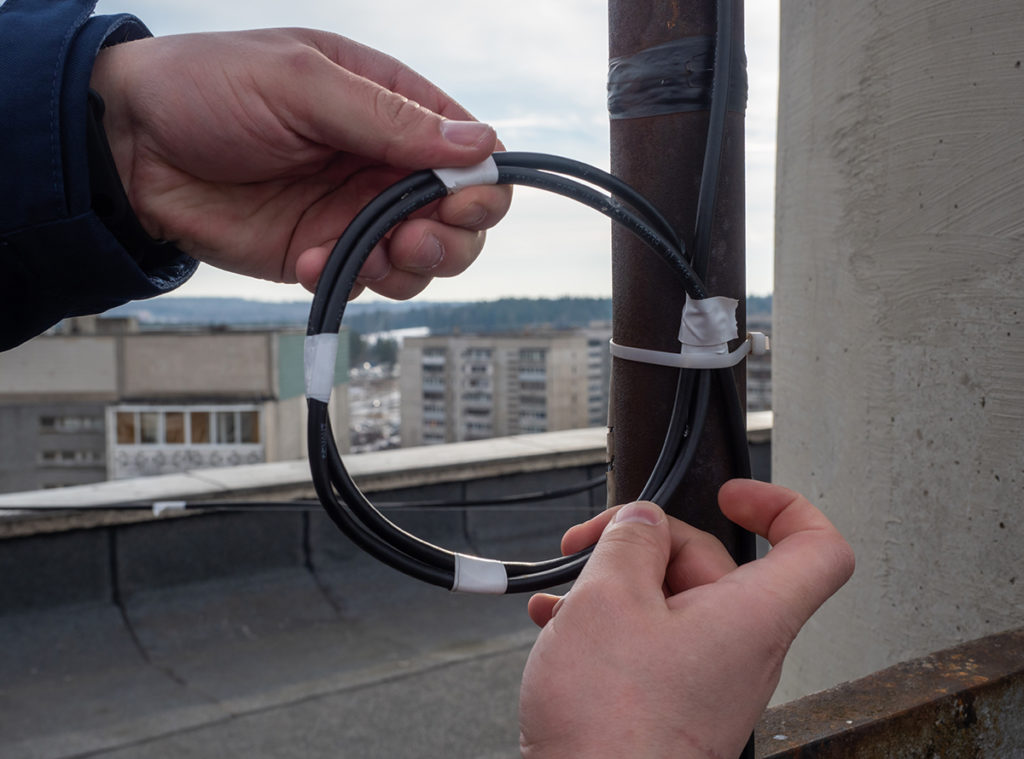 Но даже если бы мы смогли прокинуть пролет, кабель нужно было бы закрепить на специальной стойке, которую обычно устанавливают на крыше или прикручивают к фасаду. У здания предприятия двускатная разноуровневая крыша, а фасад обшит профлистом. Установить стойку в таких условиях было бы проблематично.